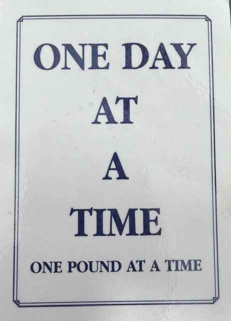 A laminated 2-sided card. One side says “One Day at a Time, One Pound at a Time.” The back has the Serenity Prayer.